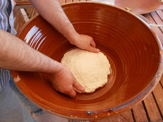 En un bol (o palangana de plástico o mejor todavía en un «llibrell» – el cacharro tan molón de la foto de abajo) se echa la harina y la levadura desmigada. Para esto necesitáis ayuda porque mientras amasáis es bueno que alguien vaya echando el agua (caliente) a la mezcla. Aquí no hay truco. Es a lo que admita la pasta. Pero para un kilo con tres o cuatro vasos ya va bien la cosa. Y paciencia. Y muchos puñetazos a la pasta. Como si fuera uno de esos que tú ya sabes que salen por la tele. Vale, vale, no tan fuerte que vais a romper la mesa.